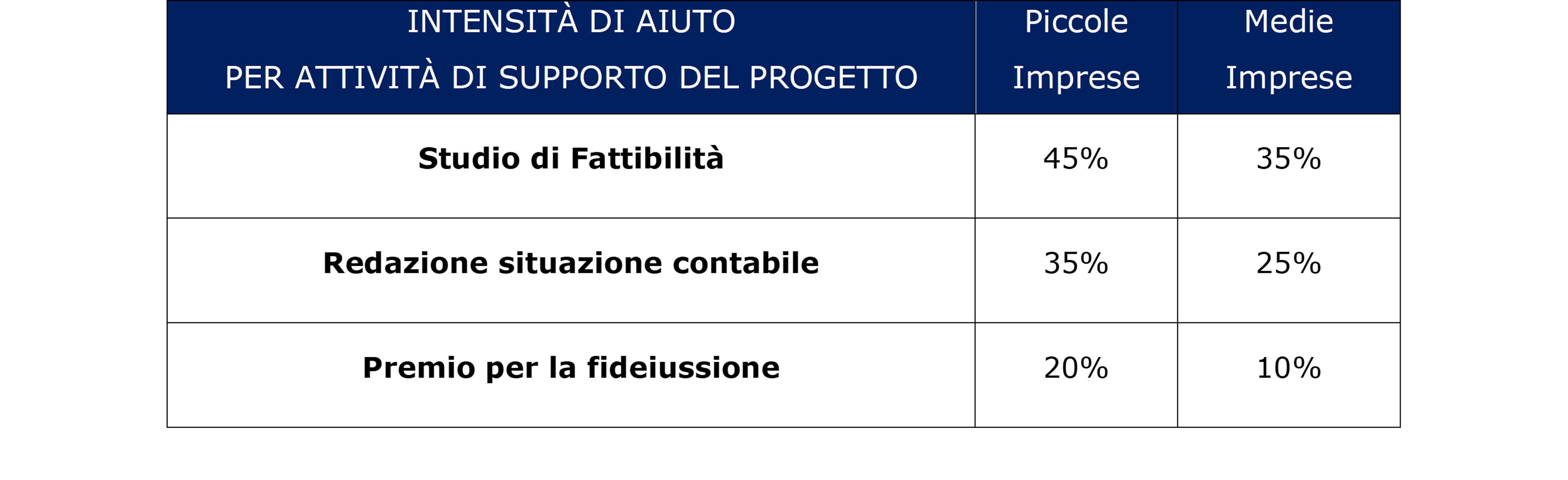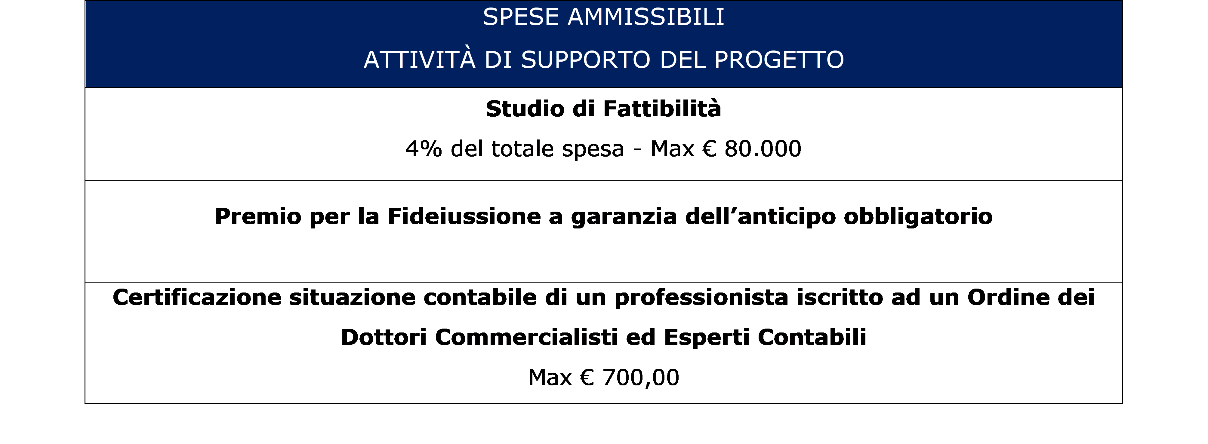 ![]() ![]() ENTITÀ DELL’AGEVOLAZIONE: A fondo perduto. Anticipo OBBLIGATORIO pari al 40% del contributo concesso. Importo del contributo: MAX € 2ml. Intensità di aiuto del 90% sulle spese ammissibili per attività di supporto del progetto. (Studio di Fattibilità, redazione situazione contabile e premio per la fideiussione) ![]() ![]() PREMIALITÀ Possesso della certificazione di Parità di Genere. |